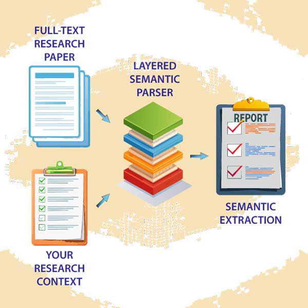Visual diagram showing how full-text research papers are parsed by layered semantic models to extract structured insights like hypotheses, methods, and findings aligned with research context